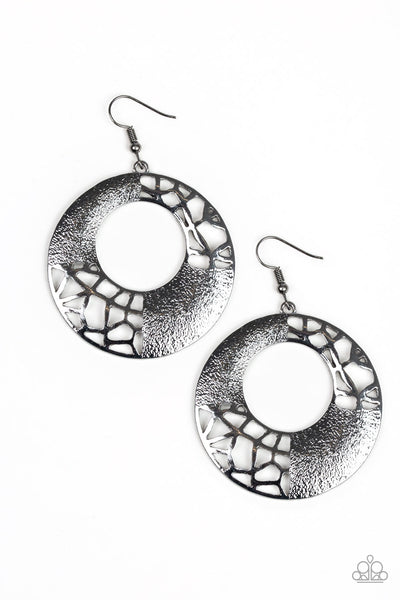 Featuring sections of shattered metallic patterns, a thick gunmetal hoop swings from the ear in an edgy industrial fashion. Earring attaches to a standard fishhook fitting.