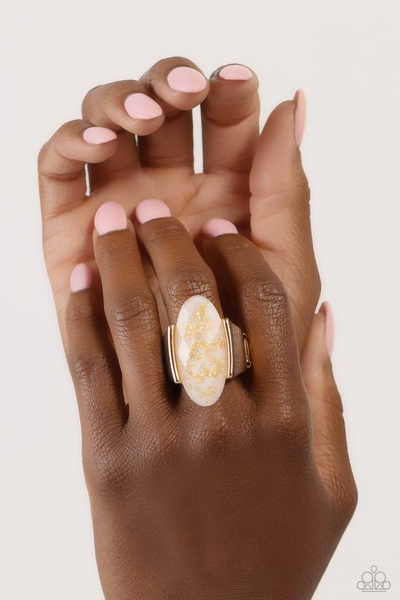Encased in an exaggerated, sleek gold frame, an elongated glassy blue oval with an opalescent finish rests atop the finger. Flecks of gold shimmer sporadically dot the inside of the glassy bead for a refined, glitzy finish. Features a stretchy band for a flexible fit.