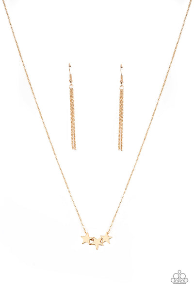 A trio of shimmery gold stars slide along a glistening gold chain below the collar for a whimsical look. Features an adjustable clasp closure.