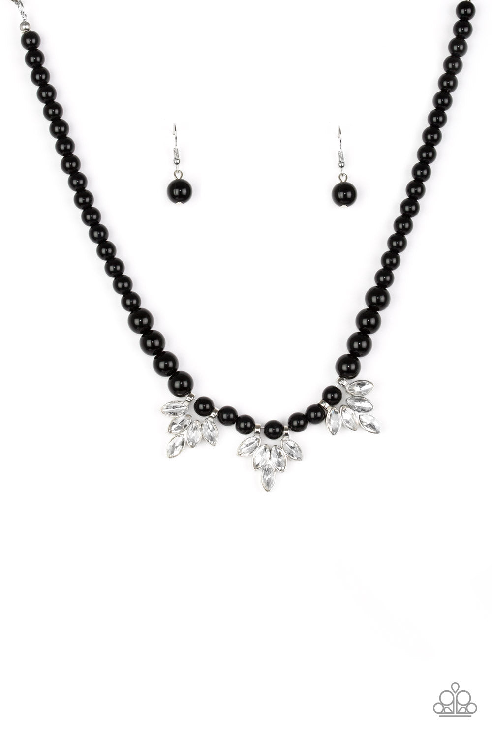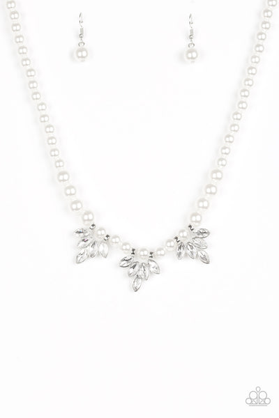 A strand of classic white pearls drapes elegantly below the collar. Featuring regal marquise style cuts, glittery white rhinestone frames swing from the pearls for a timeless finish. Features an adjustable clasp closure.