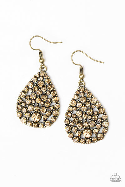 Varying in size, bubbly peach rhinestones coalesce into a blinding shiny copper teardrop for a dramatic fashion. Earring attaches to a standard fishhook fitting.