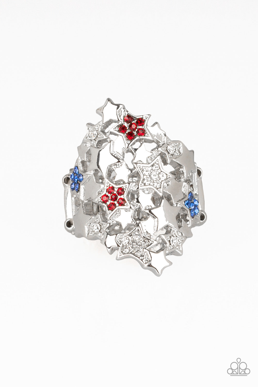 Encrusted in dainty red, white, and blue rhinestones, a collision of shimmery silver stars explode across the finger. Features a stretchy band for a flexible fit.