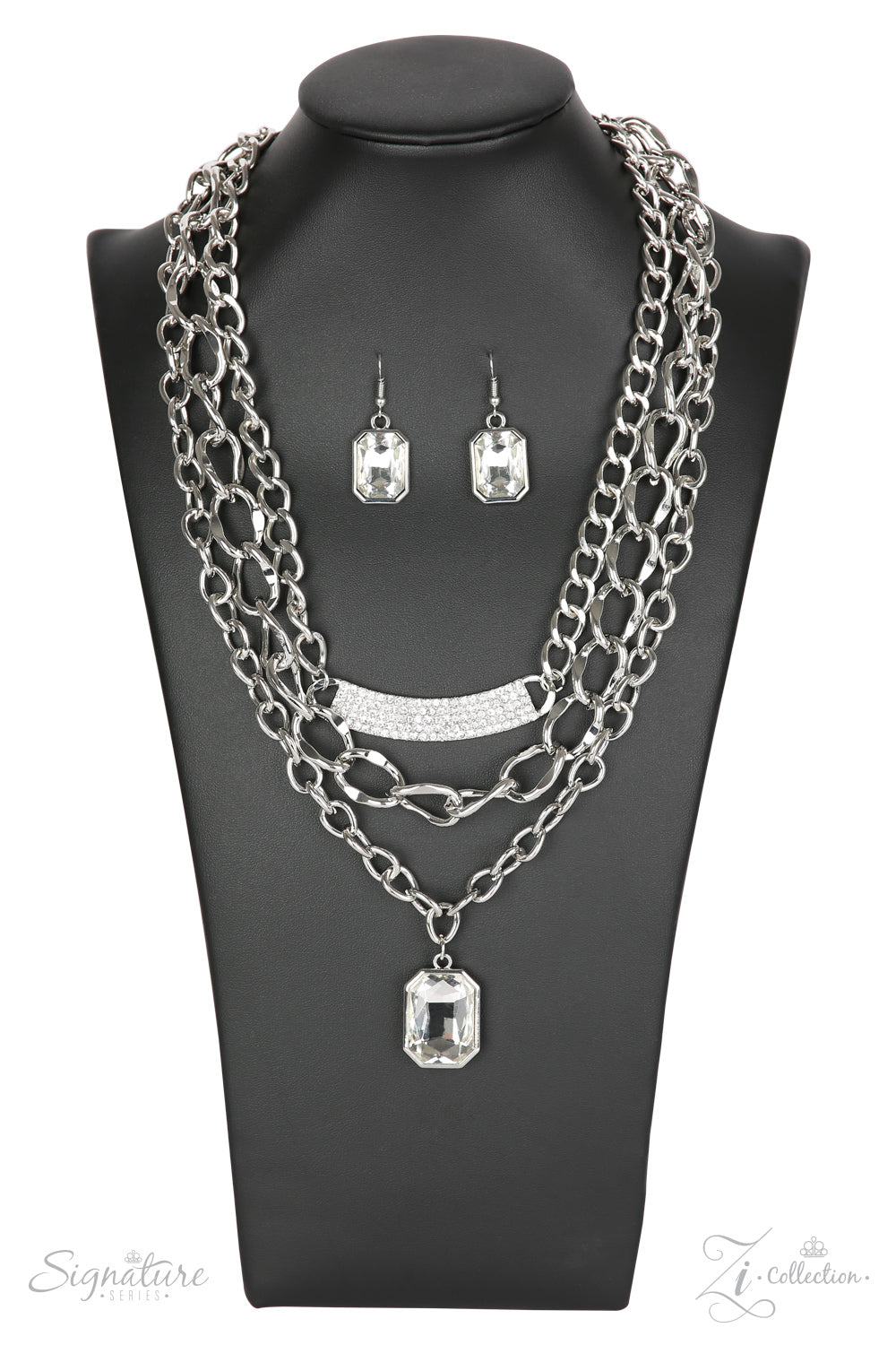 ~A large emerald-cut rhinestone drips below a mashup of oversized silver chains, creating a beautiful contrast of industrial edge and timeless sparkle. A bowing silver bar encrusted in dazzling white rhinestones adorns the topmost silver chain, adding blinding shimmer to the glitzy design. Features an adjustable clasp closure.