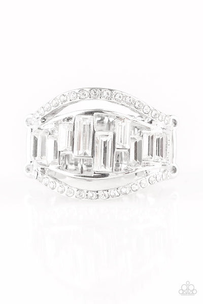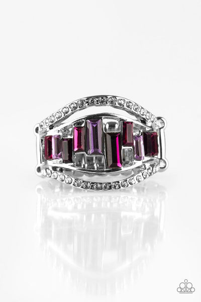 Rhinestones encrusted bands flank a row of emerald cut glass beads in shades for a regal look. Features a stretchy band for a flexible fit.
