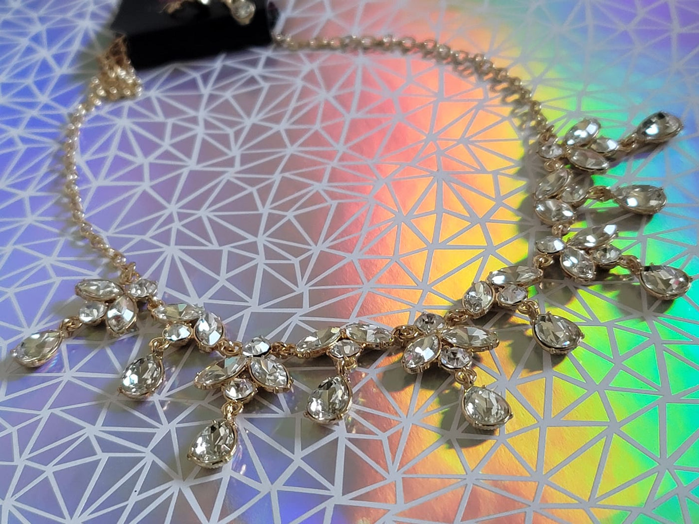 Adorned in glassy white rhinestones, leafy gold frames delicately connect below the collar. Classic white teardrop rhinestones drip from the elegant foliage, adding dazzling movement to the timeless display. Features an adjustable clasp closure.