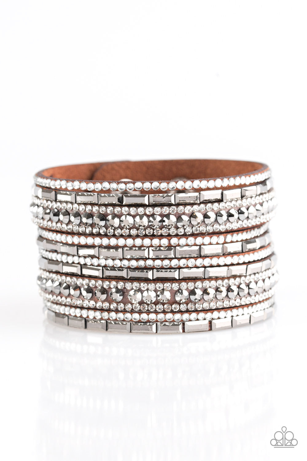 Varying in size and shape, glassy white and smoky hematite rhinestones are encrusted along strands of brown suede for a sassy look. Features an adjustable snap closure. Paparazzi Accessories