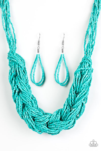Brushed in a refreshing finish, countless strands of turquoise seed beads weave into a bulky square braid below the collar. Features an adjustable clasp closure.