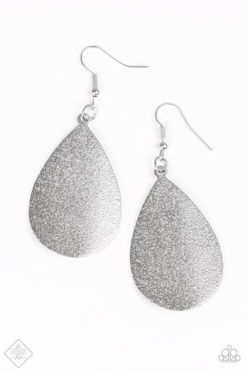A slightly rounded silver teardrop is brushed in a high-sheen glittery finish, creating a dynamically shimmery statement piece. Earring attaches to a standard fishhook fitting.